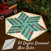 Increase your diamond design possibilities with the 60 degree Diamond Ruler. Cut 60 degree diamonds up to 8 1/2 inches; hexies up to 8-1/2 inches; and 60 degree triangles up to 8-1/2 inches. Maximize the design potential by cutting them from strip sets.